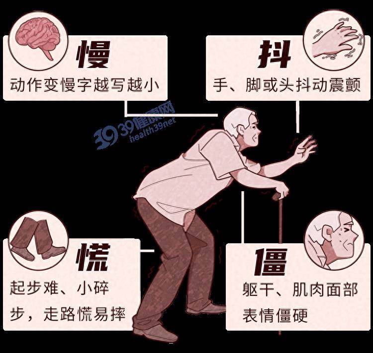 又稱原發性震顫性麻痹,癥狀表現為震顫、肌強直、姿勢及步態不穩。多發生于50~80歲,80%的患者會先從一側手臂的手指開始震顫,逐漸擴展到四肢和全身。